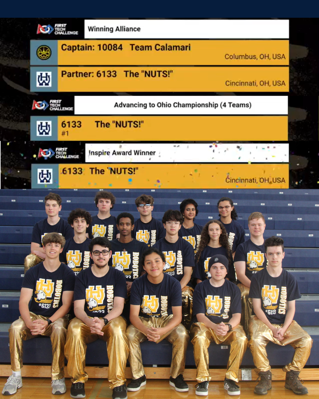 Thanks to team 16657, Ohio State Newark, and Central Ohio Technical College for hosting this qualifier. We are proud to announce that we are the first-place Inspire Award Winner and part of the Winning Alliance with team 10084 Calamari.